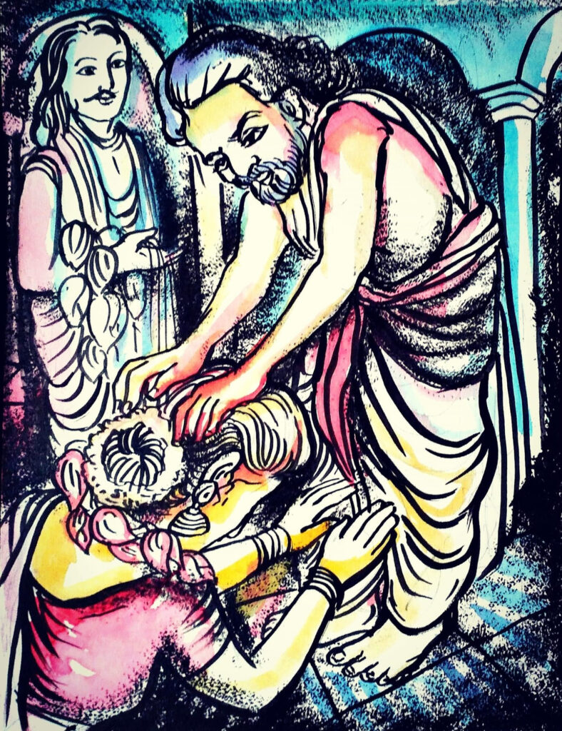 തന്നെ കണ്ടപാടെ ഉത്തരീയത്താൽ ശിരസ്സു മറച്ചു കൊണ്ട് വൃഷാലി മുന്നോട്ടു വന്നു പാദങ്ങളിൽ തൊട്ടു, കൈകൾ മുന്നോട്ട് നീണ്ടുവെങ്കിലും പകിടകളിൽ പതിഞ്ഞ കുങ്കുമം മനസ്സിൽ തെളിഞ്ഞതോടെ അനുഗ്രഹം വാക്കുകളിൽ ഒതുക്കി.