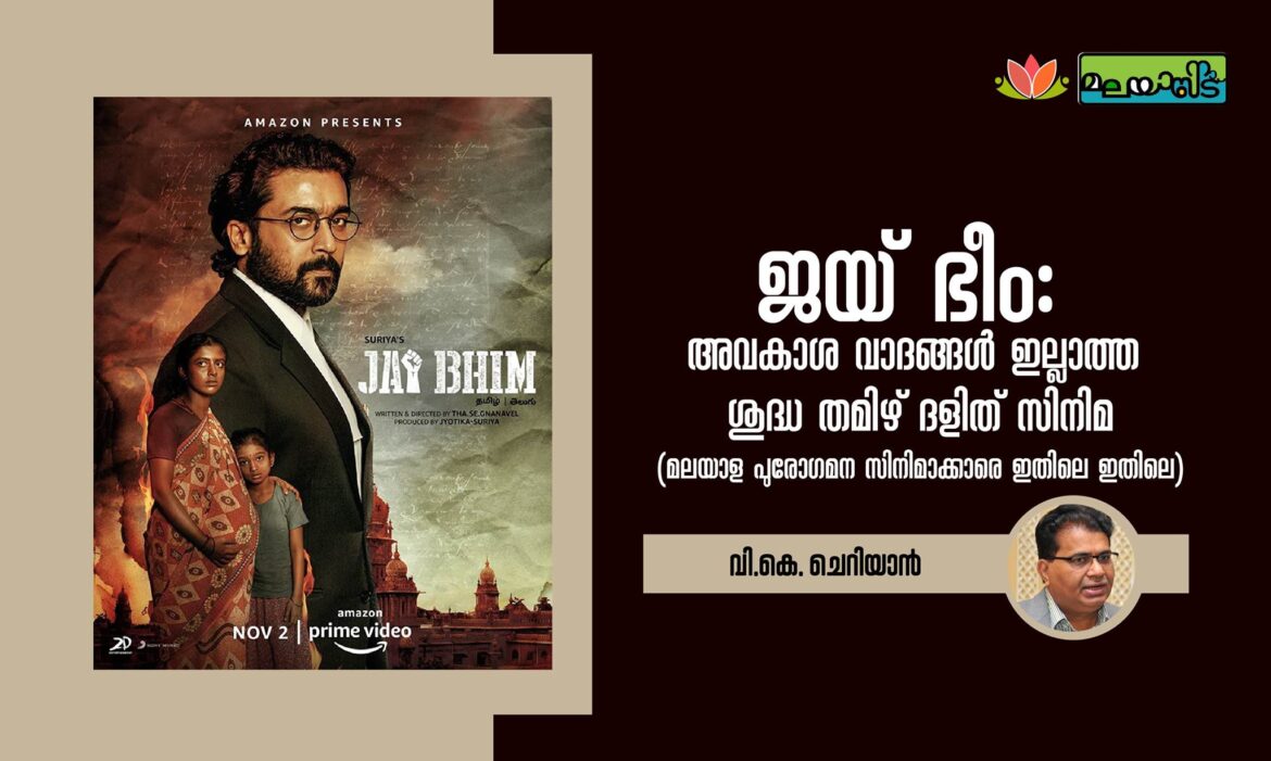 ആദ്യമേ പറയട്ടെ, “ജയ് ഭീം” ഒരു നല്ല രാഷ്ടീയ സിനിമയാണ് – ദളിത് രാഷ്ടീയത്തിന്റെ സിനിമ. കാരണം അത് പാർട്ടി രാഷ്ടീയമല്ല – ഒരു സമൂഹത്തിന്റെ, നീതിക്കും, ഭരണഘടനാപരമായ അവകാശങ്ങൾക്കും വേണ്ടിയുള്ള സമരത്തിന്റെ കഥ പറയുന്ന സിനിമയാണത് . മിക്ക ഇടതു പക്ഷ രാഷ്ടീയക്കാരുടെ സിനിമകൾ പോലെ ഈ സമരം, സർക്കാരിന്റെ മാറ്റത്തിന്റെ, വിപ്ലവത്തിൽ അല്ല അ വസാനിക്കുന്നതു – മറിച്ചു ഇന്നത്തെ വ്യവസ്ഥയിൽ നിന്നും കീഴാളർക്ക് നീതി ലഭിക്കുന്നതിൽ അവസാനിക്കുന്നു. രണ്ടര മണിക്കൂർ നമ്മൾ കാണുന്നത് അവരുടെ ജാതിപരമായ ശോച്യാവസ്ഥ,ഭരണ സംവിധാനങ്ങളുടെ അവരെ പറ്റിയുള്ള നിഷ്കാസനപരമായ പെരുമാറ്റം, പീഡനം ഒക്കെയാണ്. കൂടെ അതിനെതിരെ കോടതി വഴി ഒറ്റയാൾ പട നയിക്കുന്ന ഒരു മനുഷ്യാവകാശ വക്കീലിനെയും നാം കാണുന്നു. അത് കൊണ്ട് തന്നെ രാഷ്ടീയത്തിനുപരി, മാനുഷിക തലത്തിലേക്ക് – ജാതി എന്ന ദുർഭൂതത്തിന്റെ നിരാകരണത്തിലേക്കു, നീതി എല്ലാവര്ക്കും തുല്യമാണ് എന്ന ഭരണഘടനാ വസ്തുതയിലേക്കു ഈ ചിത്രത്തിന്റെ പ്രമേയവും കഥയും നമ്മെ നയിക്കുന്നു.