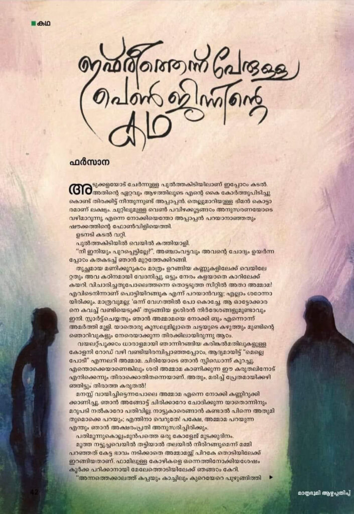 തീർച്ചയായും, വാക്കുകളുടെ പരിമിതമായ ഉപയോഗവും എഡിറ്റിങ്ങും നല്ല കഥയെ വേറിട്ട് നിർത്തും. ഇങ്ങനെ നോക്കുമ്പോൾ, ഈയടുത്ത് വായിച്ച കഥകളിൽ, ഔട്ട്സ്റ്റാന്റിങ് എന്ന് പറയാവുന്ന കഥയാണ്, ഫർസാന എഴുതിയ ‘ഇഫ്രീത്ത് എന്ന് പേരുള്ള പെൺജിന്നിന്റെ കഥ’.