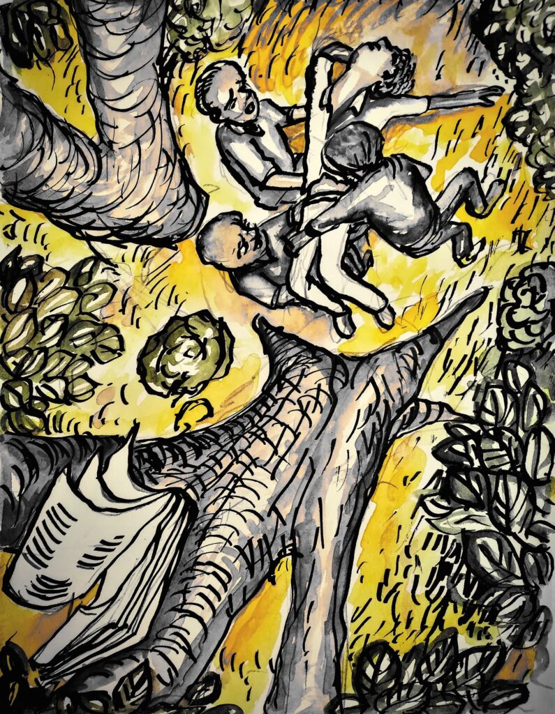 വൻമരത്തിന്റെ തണലിലിരുന്ന് അവനെന്തോ കുത്തിക്കുറിക്കാറുണ്ടായിരുന്ന കാര്യം ഓർമിപ്പിച്ചു കൊണ്ട് , മരച്ചില്ലയിലെയിടുക്കിൽ ഒളിപ്പിച്ച പുസ്തകത്തിലേക്ക് ഒരില വന്നു വീണു. മനുഷ്യരെഴുതുന്നത് വായിക്കാനൊന്നും നമുക്കാവില്ലല്ലോയെന്ന് വൻമരം സങ്കടപ്പെട്ടപ്പോൾ അവരെ ഞെട്ടിച്ചു കൊണ്ട് പുസ്തകമതിന്റെ താളുകൾ മറിച്ച് വായന തുടങ്ങി.