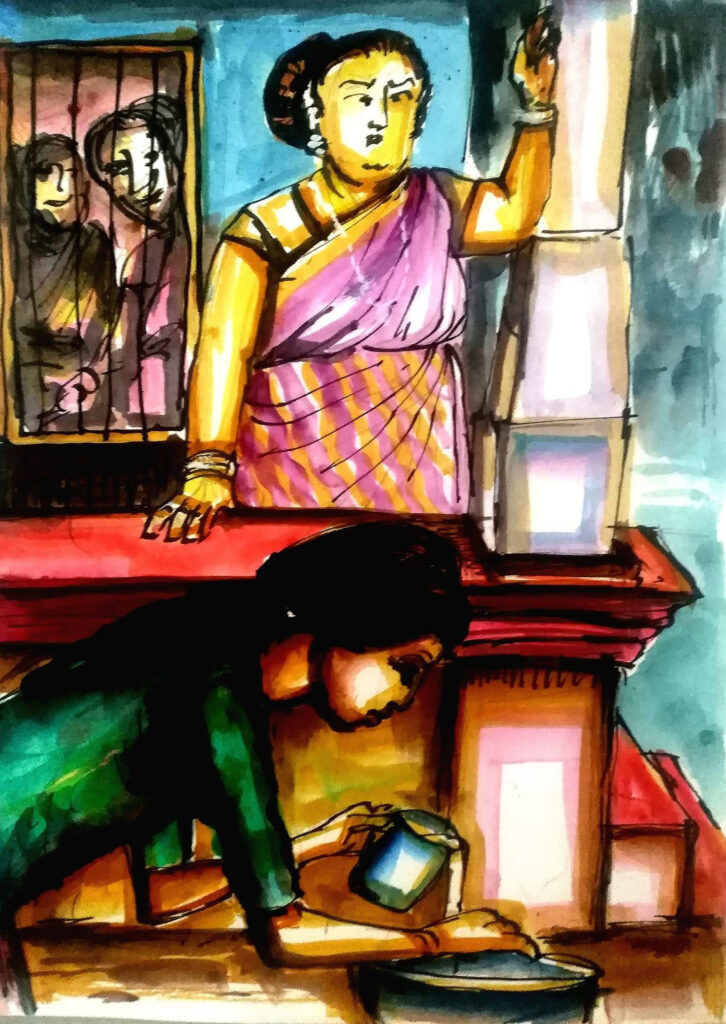 ജോലിക്കാരുടെയോ, യജമാനത്തിയുടെയോ രണ്ടിടത്തും ഇടമില്ലാത്ത ഒരുവളായ് അവളാവലിയ വീടിന്റെ ഒഴിഞ്ഞ കോണിൽ കാൽമുട്ടുകളിൽ മുഖം പൂഴ്ത്തിയിരുന്നിരുന്നു.