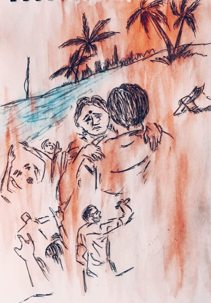 ” ഇന്ന് ഡോക്ടറെക്കാണണ്ട ദിവസായിരുന്നില്ലേ… അത് കഴിഞ്ഞ് അമ്മ്എ … ബീച്ച് കാണിക്കാൻ കൊണ്ടുപോയതാ… കുറെപ്പേര് ഞങ്ങളെ… ” അവൻ മുഴുമിപ്പിക്കും മുമ്പേ എൻ്റെ കണ്ണിലിരുട്ടു കയറി. അവന്റെ ശബ്ദം മറുതലയ്ക്കൽ നേർത്തുപോകുന്നു – ” അമ്മേം മകനുമാന്ന് പറഞ്ഞിട്ടൊന്നുമവര്… ” അവന്റെ വിങ്ങൽ വേറേതോ ഗ്രഹത്തിലെന്നവണ്ണം കേൾക്കേ , ആൾക്കൂട്ടമെന്റെചുറ്റും നിന്നാർത്തുകൊണ്ടേയിരുന്നു.