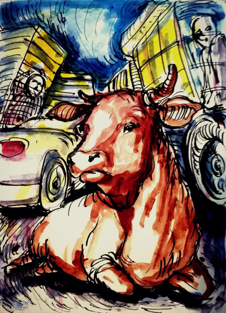 റോഡിന് നടുവില് അതിന് സമാന്തരമായി ഒരു വലിയ സിന്ധിപ്പശു കിടക്കുന്നു ! ഏതെങ്കിലും വാഹനം ഇടിച്ചു വീഴ്ത്തിയതാണോ എന്ന എന്റെ സംശയം അടുത്ത് നിന്നിരുന്ന തുന്നൽക്കടക്കാരൻ തീർത്തുതന്നു.