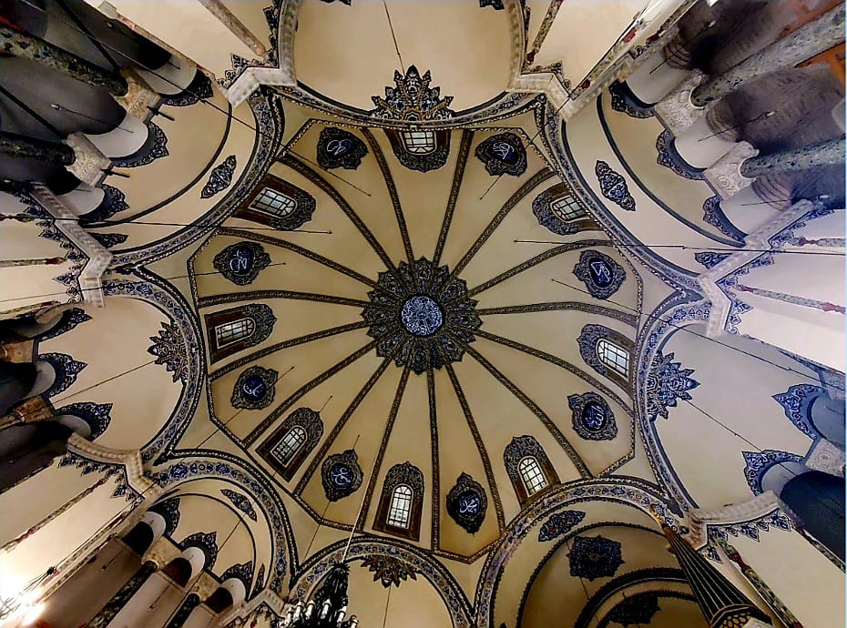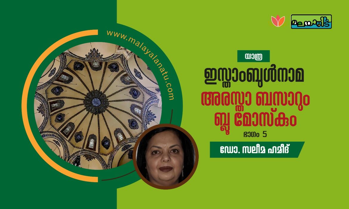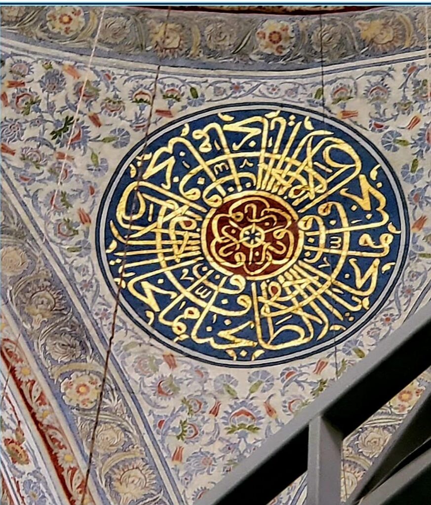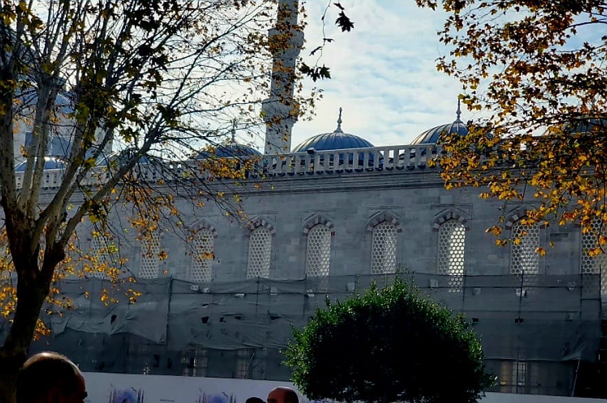 പുനരുദ്ധാരണത്തിനായി ഉയർത്തിയിരിക്കുന്ന സ്കഫോൾഡിങ് കൊണ്ട് മറഞ്ഞിരിക്കുകയാണ് ബ്ലൂ മോസ്കിലെ കാഴ്ചകൾ. ഇത് മൂലം അവിടെ വലിയ തിരക്ക് കണ്ടില്ല. നല്ല ഒരു ഫോട്ടോ പോലും എടുക്കാനുള്ള സാധ്യത കണ്ടില്ല. ഇതിനിടയിലും ആ മഹത്തായ കലാസൃഷ്ടിയുടെ സൗന്ദര്യം തെളിഞ്ഞു കണ്ടു. നീലയുടെ പല ഷെയ്ഡുകളാണ് അവിടെ തറ മുതൽ മേൽത്തട്ടു വരെ. ഓട്ടോമൻ കാലത്തെ ചിത്രകലയുടെ പ്രത്യേകതകളും ഭംഗിയും ഇതിൽ തെളിഞ്ഞ് കാണാം. ഇസ്ലാമിക കാലിഗ്രാഫിയുടെ സുന്ദരമാതൃകകളും ഇവിടെയുണ്ട്. ഖുർആനിലെ വളരെ ചെറിയ കുറേ അധ്യായങ്ങൾ ഇവിടെ അലങ്കാരങ്ങൾക്കായി ഉപയോഗിച്ചിരിക്കുന്നത് കണ്ടു. അതിൻറെ ചിത്രങ്ങളോട് കൂടിയ വിവരണങ്ങൾ താഴെ പ്രദർശിപ്പിച്ചിട്ടുണ്ട്.