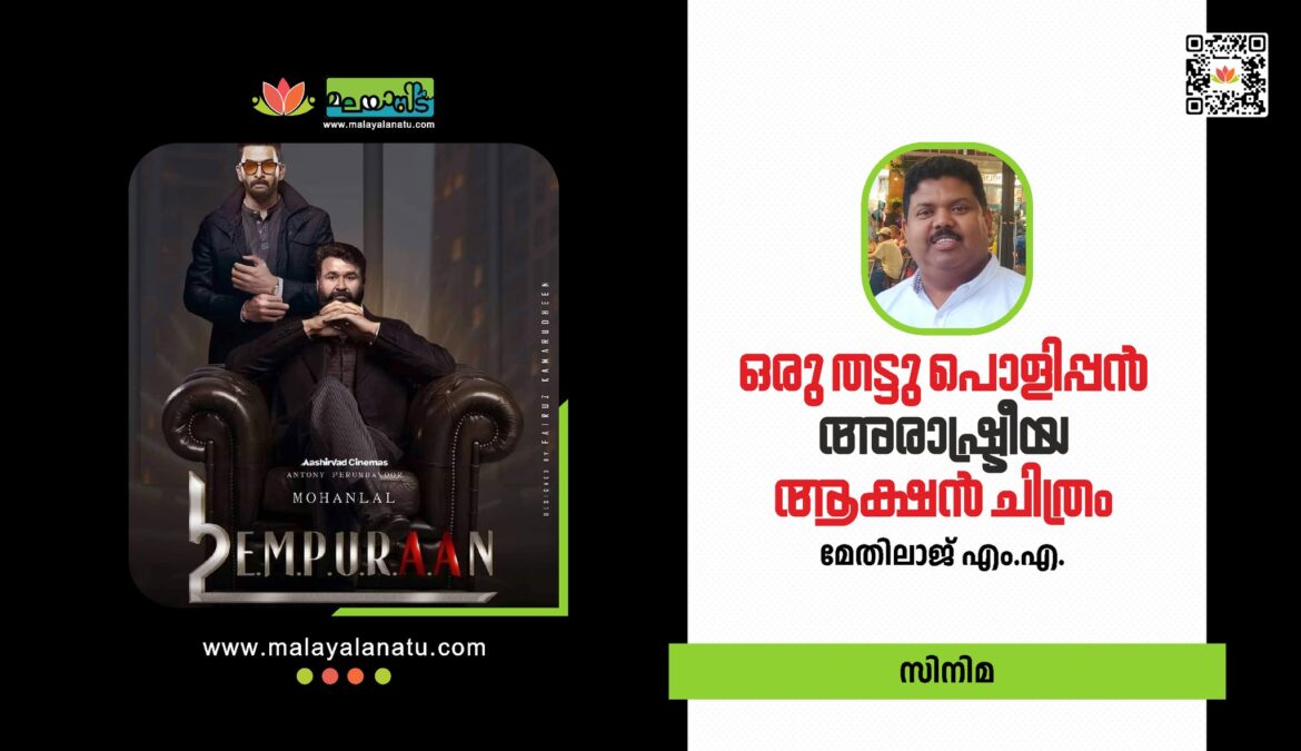 എമ്പുരാന്‍ അങ്ങിനെ മനോഹരമായി ചിത്രീകരിക്കപ്പെട്ട, ശക്തമായ കഥയുടെ പിൻബലമുള്ള, അല്ലെങ്കിൽ ശരിയായ രാഷ്ട്രീയം പറയുന്ന ഒരു സിനിമ പോലുമല്ല. എല്ലാ വിധ മസാലകളും ചേർത്ത, യുവാക്കൾക്ക് വേണ്ടി മാത്രം നിർമ്മിച്ച ഒരു ആക്ഷൻ ചിത്രമാണ്. ഇതിന്റെ വൺ ലൈൻ കഥ ആയി രാഷ്ട്രീയത്തിന് പകരം പ്രണയം ആയിരുന്നെങ്കിലും ചിത്രം മോഹൻലാൽ – പൃഥി ഫാൻസിനിടയിൽ ഹിറ്റ് ആയേനെ. സത്യത്തിൽ മസാലക്കൂട്ടുകൾ വേണ്ടവിധം ചേർത്തപ്പോൾ ചേർക്കാൻ മറന്നു പോയ പ്രണയവും ഡപ്പാം കുത്ത് ഡാൻസും സിനിമയുടെ ആരാധകരെ നിരാശപ്പെടുത്തുന്നുമുണ്ടാവാം.