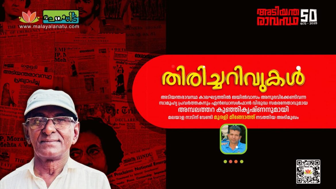 അടിയന്തിരാവസ്ഥ കാലഘട്ടത്തിൽ ജയിൽവാസം അനുഭവിക്കേണ്ടിവന്ന സാമൂഹ്യ പ്രവർത്തകനും എൻഡോസൾഫാൻ വിരുദ്ധ സമരനേതാവുമായ അമ്പലത്തറ കുഞ്ഞിക്കൃഷ്നുമായി മലയാളനാട് വെബ് ജേണലിനുവേണ്ടി മുരളി മീങ്ങോത്ത് നടത്തിയ അഭിമുഖം. എഡിറ്റിംഗ് & കവർ ഡിസൈൻ : ജ്യോതിസ് പരവൂർ Comments മുരളി മീങ്ങോത്ത് ഇന്ത്യന് വ്യോമസേനയിലായിരുന്നു. ആനുകാലികങ്ങളില് എഴുതാറുണ്ട്. മുന്നത്തെ പോസ്റ്റ് ഫ്രം റഷ്യ വിത്ത് ലവ്: ഒരു റഷ്യൻ യാത്ര (ഭാഗം 2) അടുത്ത പോസ്റ്റ് കേളുമാഷ് (ഭാഗം 3) You may also like ചരിത്രത്തിന്റെ വേരുകളിൽ പുഷ്പിക്കുന്ന മിത്തുകൾ October 26, 2025 രൂപകങ്ങൾക്കുള്ളിലെ ജീവിതങ്ങൾ July 19, 2025 പ്രകൃതിയുടെ നാനാർത്ഥങ്ങൾ March 7, 2025 സമരപാത: പോരാട്ടങ്ങളും, അതിജീവനങ്ങളും February 19, 2025 കൃഷിയും കാർഷിക പ്രവർത്തനവും September 29, 2023 മാറുന്ന കൃഷി സൂത്രങ്ങൾ September 28, 2023 കൃഷി – ഒരു ജീവിത വീക്ഷണം September 27, 2023 സൂക്ഷ്മ പുനരുജ്ജീവന കൃഷി September 19, 2023 ഐ. ഷൺമുഖദാസ്: എഴുത്ത്, സിനിമ, ജീവിതം March 26, 2023 മരതകദ്വീപിന്റെ കഥാകാരന് October 22, 2022