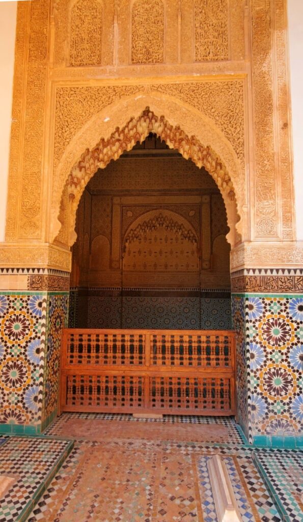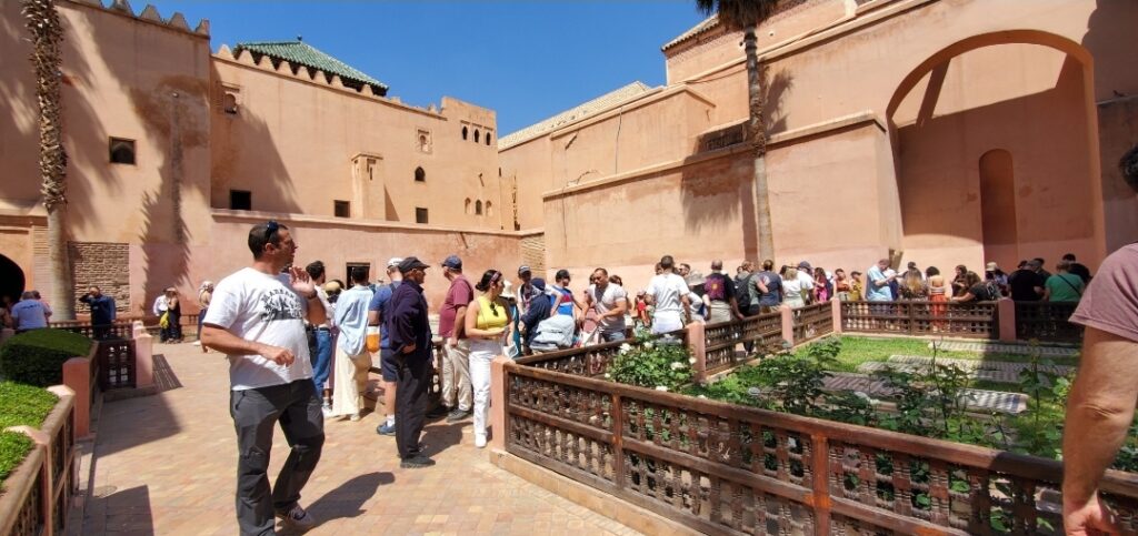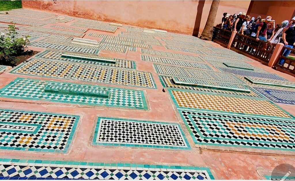 മരാക്കെഷിൽ ഏറ്റവും കൂടുതൽ സന്ദർശകർ എത്തുന്ന ഒരിടമാണിത്. 70 മൊറോക്കൻ ദീനാർ കൊടുത്ത് ടിക്കറ്റ് എടുത്തു കഴിഞ്ഞാൽ ഇടുങ്ങിയ ഒരു വഴിയിലൂടെ ഉള്ളിലേക്ക് നടന്നെത്തുന്നത് വളരെ വിശാലമായ ഒരു നടുമുറ്റത്താണ്. അമേരിക്ക, യൂറോപ്പ്, മദ്ധ്യപൂർവ്വദേശങ്ങൾ എന്നിവയിൽ നിന്നാണ് സന്ദർശകൾ അധികവും. ഇന്ത്യാക്കാരായി ഞങ്ങളെ മാത്രമേ അവിടെ കണ്ടുള്ളു. നാരക മരങ്ങളും റോസാച്ചെടികളും നിറഞ്ഞ ഇതിൻ്റെ പല ഭാഗങ്ങളിലായാണ് ശവകുടീരങ്ങൾ. 170 രാജകുടുംബാംഗങ്ങളുടെ ശവക്കല്ലറകൾ കെട്ടിടങ്ങളുടെ ഉള്ളിലും, അവരുടെ ഉദ്യോഗസ്ഥ പ്രമാണികളുടേത് തുറന്നയിടങ്ങളിലുമാണ് സ്ഥിതി ചെയ്യുന്നത്. മിക്കവാറും എല്ലാംതന്നെ പച്ച, കറുപ്പ്, കാപ്പിത്തവിട്ട്, നീല, വെള്ള എന്നീ നിറങ്ങളിലുള്ള സെറാമിക് ടൈലുകളുടെ പലതരം അലങ്കാരരൂപങ്ങൾ പൊതിഞ്ഞ് ഭംഗിയാക്കിട്ടുണ്ട്.