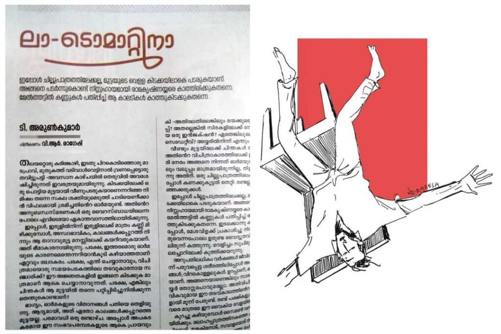 മെലിഞ്ഞുണങ്ങി ചോര ഞരമ്പ് പോലുള്ള തൊടിന്റെ തീരത്തെത്തുന്ന ബാലചന്ദ്രന്റെ കഥ വായിക്കുമ്പോൾ ഓ വി വിജയന്റെ “കടൽ തീരത്ത്” എന്ന കഥയിലെ തൂക്കി കൊല്ലാൻ വിധിച്ച മകനെ ജയിലിൽ കണ്ട് കടൽത്തീരത്തെത്തുന്ന അച്ഛൻ വെള്ളായിയപ്പന്റെ ദുഖവും ഓർമ്മ വരുന്നു.