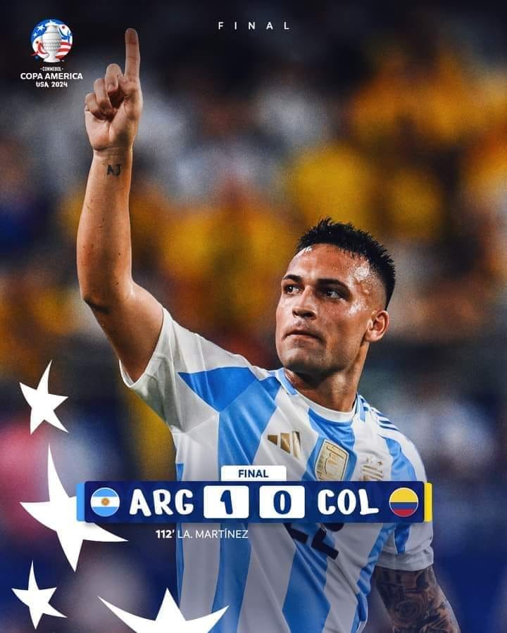 അമേരിക്കയിലെ ഫ്ലോറിഡയിലെ ഹാർഡ് റോക്ക് സ്റ്റേഡിയത്തിൽ ടിക്കറ്റ് എടുക്കാത്ത കാണികളുടെ തള്ളിക്കയറ്റം കാരണം ഒന്നര മണിക്കൂർ വൈകിത്തുടങ്ങിയ കോപ്പാ അമേരിക്കൻ ഫുട്ബോൾ ഫൈനലിൽ കൊളംബിയ അർജന്റീനയെ വിറപ്പിച്ചു നിർത്തിയെങ്കിലും എക്സ്ട്രാ ടൈമിലെ 112 ആം മിനുട്ടിൽ ലൗറാറ്റൊ മാർട്ടിനസ് അടിച്ച ഗോളിൽ അർജന്റീന തുടർച്ചയായി രണ്ടാം തവണയും ചാമ്പ്യന്മാരായി. ഈ ടൂർണമെന്റിൽ ലൗറാറ്റൊയുടെ അഞ്ചാമത്തെ ഗോൾ. ലൗറ്റാറോയിക്ക് ഗോൾഡൻ ബൂട്ടും കിട്ടി. സ്കലോണി വിജയങ്ങൾ രചിക്കുന്ന പരിശീലകനായി. ലോക കപ്പ്, 2 കോപ്പാ കിരീടങ്ങൾ, ഫൈനലസീമ അങ്ങനെ നാല് കിരീടങ്ങൾ. ഫൈനലിൽ പരിക്കേറ്റ മെസ്സിയ്ക്ക് 67 ആം മിനുട്ടിൽ പുറത്തു പോകേണ്ടി വന്നു.കൊളംബിയയുടെ അക്രമണങ്ങളെ ഫലപ്രദമായി തടഞ്ഞത് അർജന്റീനയുടെ പ്രതിരോധ നിരയിലെ ലിസൻഡ്രോയും റൊമാരിയോയുമാണ് .ഡീപ്പോളും കളം നിറഞ്ഞു കളിച്ചു.